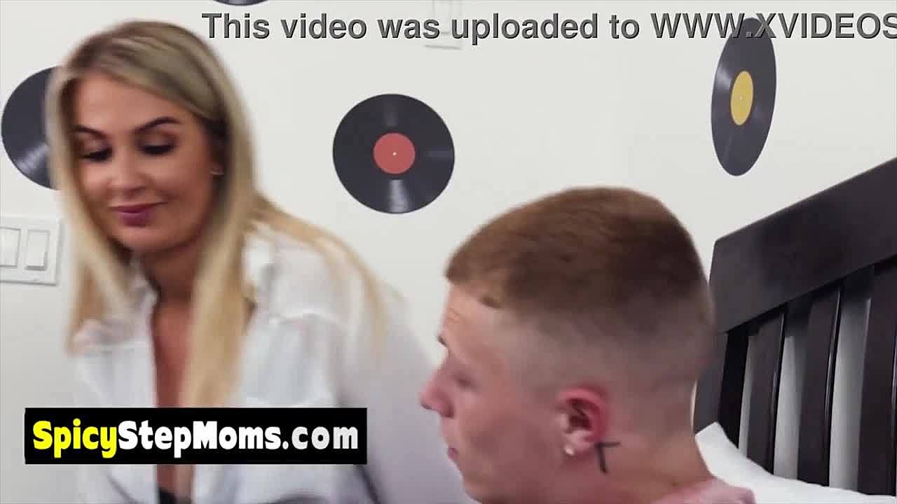 blonde stepmom eagerly rides her stepson’s hard cock.