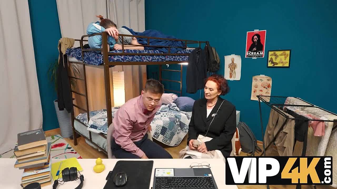 I watch as the granny gets bent over and tastes the young guy's jizz in her mouth.